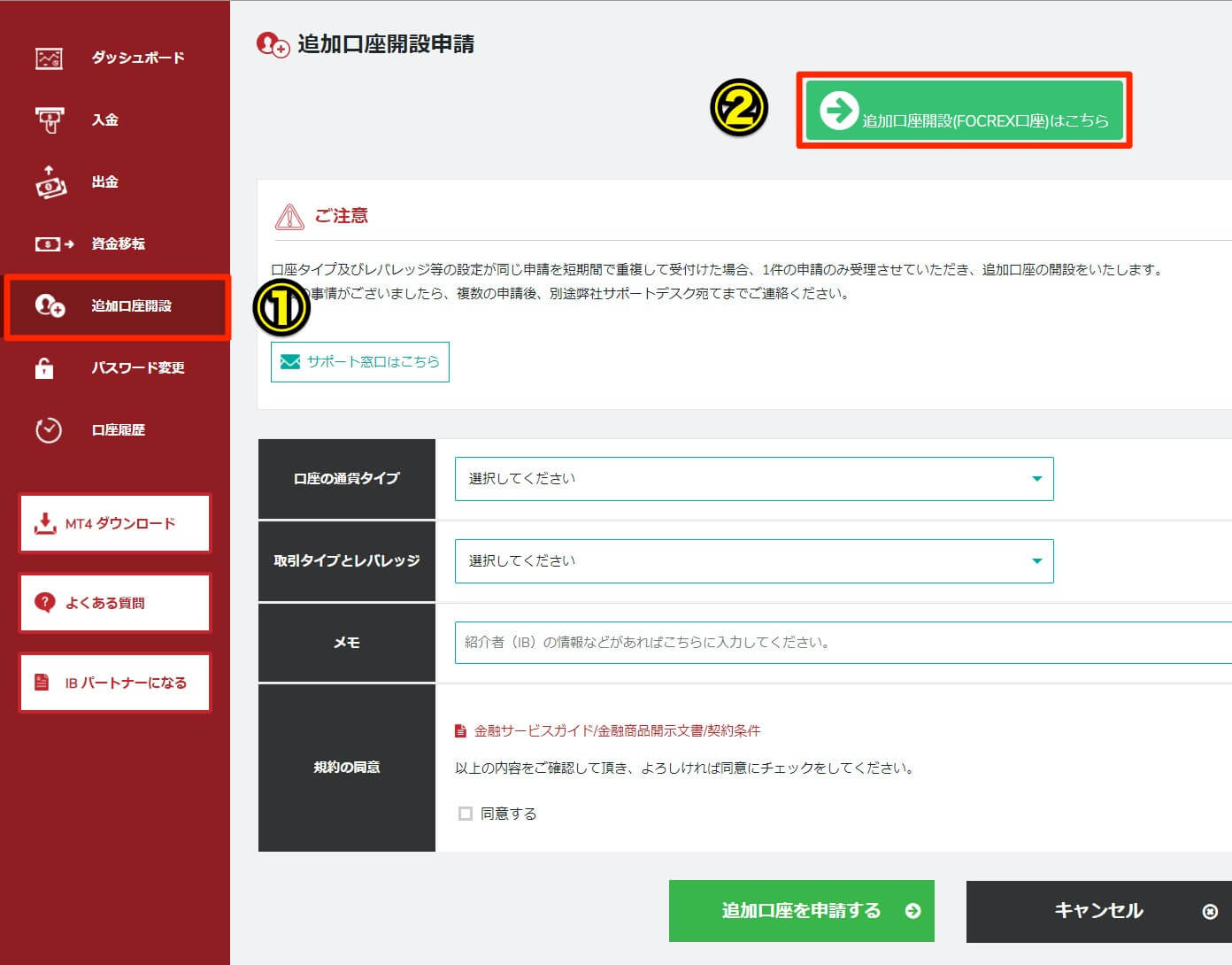 ①: Open My Page and click “Open an additional account” or “Click here to open an additional account (FOCREX account)”