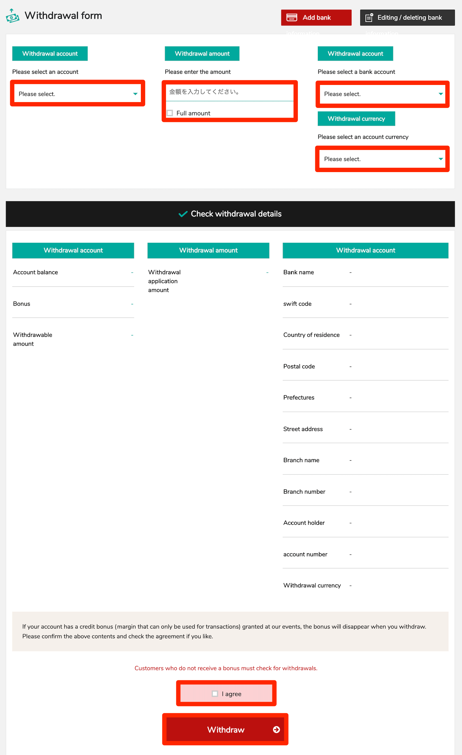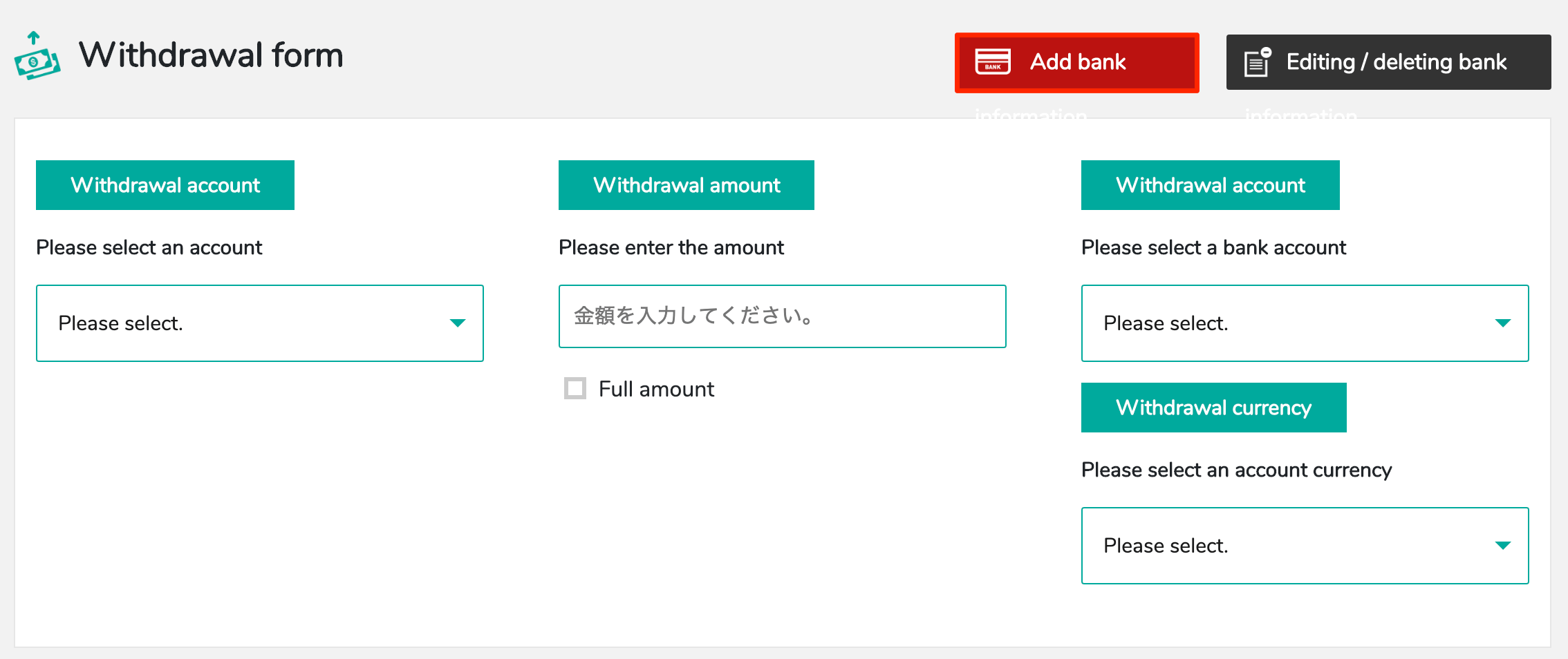 - Select the bank account currency to withdraw