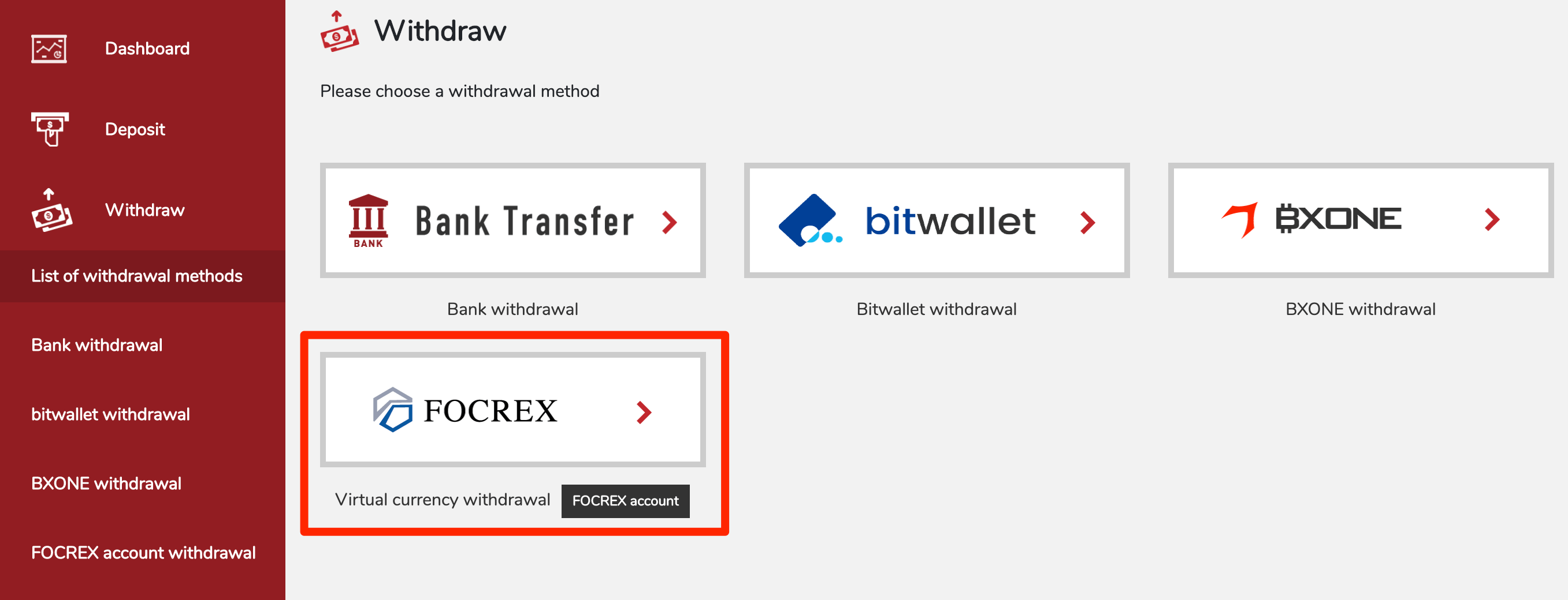2:Click “Click here to withdraw by cryptocurrency (FOCREX)”